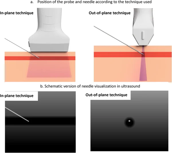 Um eine RA sicher und effektiv durchführen zu können sind fundierte Kenntnisse über Ultraschall, Anatomie und Pharmakologie notwendig. Die Hand-Schallkopf-Nadel-Koordination gehört mit zu den am schwierigsten erlernbaren Skills in der klinischen Anästhesiologie. Wir brauchen diese Technik nicht nur für die RA, sondern auch für die Anlage von intravaskulären Zugängen wie arterielle, periphervenöse oder zentralvenöse Katheter (Walk-Down Technique). Man unterscheidet allgemein zwei Zugangswege zu anatomischen Zielstrukturen: In Plane (Nadel längs in Schallebene dargestellt) und Out Of Plane (Nadelspitze quer in Schallebene dargestellt). Bitte beachtet, dass ultraschallgezieltes Stechen nicht einfach zu erlernen ist. Es reicht auch nicht aus, dies nur an einem Modell zu beüben bzw. gar einen echten Notfallpatienten als „Erstsubjekt“ heranzuziehen. Dies gilt nicht nur für intravaskuläre Katheter, sondern auch für die Anlage der RA. In der Regel kann man ein „Gestocher“ beobachten, welches sich minutenlang in die Länge zieht und dann auch regelhaft nicht zum Erfolg führt.