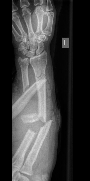 Nach Übernahme führte ich parallel mit den Unfallchirurgen (UCH) ein xABCDE-Schema durch, eine akute Lebensgefahr bestand zunächst nicht, ein Transfusionsbedarf lag auch nicht vor. Den UCH machte jedoch der li. Unterarm Sorgen, da er klinisch Hinweise auf eine Ischämie aufwies – es bestand somit die Gefahr einer Unterarmamputation. Bei desaströsem Venenstatus (1x grün vom Notarzt) setzte ich ultraschallgezielt einen weißen Venflon (Cubita) und arteriellen Zugang (A. radialis dextra). Daraufhin führten wir ein Röntgen und ein Polytrauma-CT durch, in dem sich die vom Notarzt gelisteten Diagnosen bestätigten.