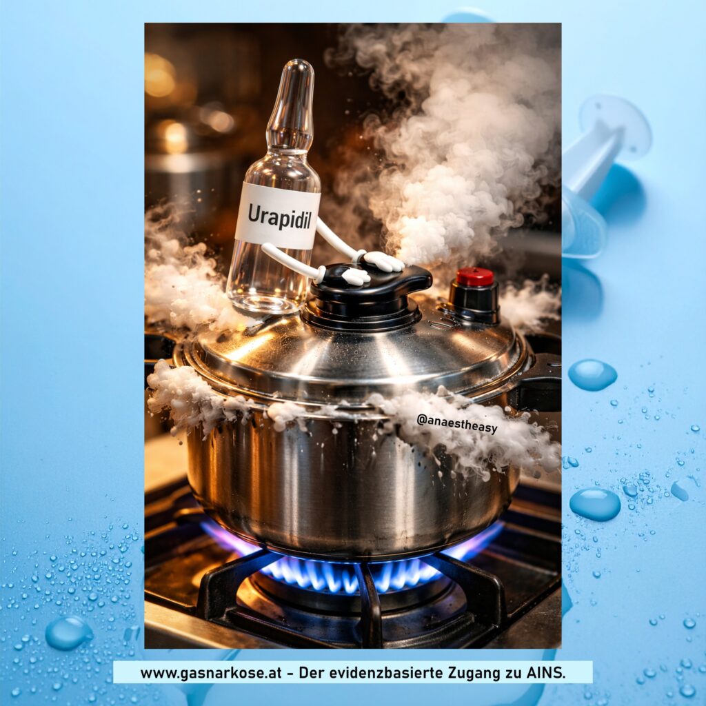 Urapidil ist ein Antihypertensivum, welches primär über peripheren α1-Antagonismus vasodilatierend wirkt. Normalerweise würde solch eine Blockade von einer kompensatorischen Tachycardie gefolgt sein (Blutdruck = Herzzeitvolumen x systemischer Gefäßwiderstand), dies wird aber durch Agonismus an zentralen Serotonin-Rezeptoren (5HT1A, Sympathikolyse) unterbunden (hier). Ich verabreiche typischerweise 10 mg i.v. alle 5 Minuten bis zu einer Maximaldosis von 100 mg (siehe Fachinfo). Die Wirkdauer beträgt wenige Stunden. Bei Patienten im hohen Alter oder mit Hypovolämie kann eine übliche Dosis (10 mg) zu einem drastischen RR-Abfall führen; hier verabreiche ich zunächst nur 2,5 mg i.v. (Testdosis) und kontrolliere den RR engmaschig. Bei refraktärer RR-Erhöhung kann Urapidil z.B. mit Clonidin, Labetalol oder Glyceroltrinitrat kombiniert werden.
